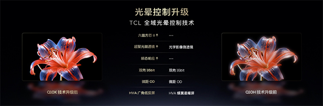 為了進一步提升畫質,Q10K Pro還采用TCL獨有的全域光暈控制技術。這項技術通過六晶方芯II、超聚光微透鏡、瞬態(tài)響應和雙向16bit、微距OD以及HVA廣角低反屏等先進技術,有效解決了光暈問題。