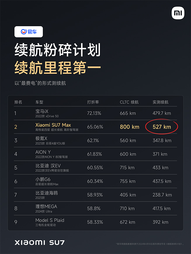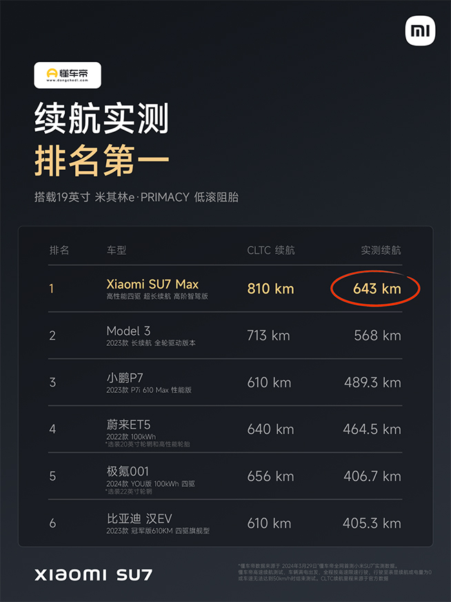 根據(jù)懂車帝、汽車之家、易車網(wǎng)等三家專業(yè)汽車垂直媒體的續(xù)航測試,小米SU7在各榜單所有車型的實(shí)測續(xù)航里程均排名第一。在專業(yè)汽車媒體新出行的高速 NOA橫評中,小米SU7實(shí)現(xiàn)全程零接管,媲美小鵬和華為,達(dá)到行業(yè)領(lǐng)先水平。