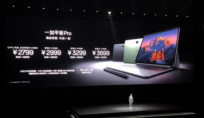 其它主要配置方面,一加平板Pro配備12.1英寸LCD屏,擁有3K分辨率303 PPI,7:5顯示比例,內(nèi)置六揚(yáng)聲器,整機(jī)重584g,厚度不足6.5mm,還支持低延遲超跟手的手寫筆。一加平板Pro首發(fā)價(jià)2799元起,頂配16GB+512GB首發(fā)價(jià)3699元。