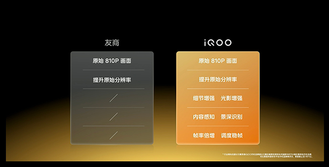 發(fā)布會上,iQOO強調對于電競旗艦而言,“無雙芯,不旗艦”,顯然此話是在內涵前些天發(fā)布的真我GT6,這也是iQOO Neo9S Pro+的競品之一。在藍廠自研電競芯片Q1的加持下,iQOO Neo9S Pro+提供穩(wěn)定的超分超幀并發(fā),號稱擁有“PC級超分”。比如玩某開放世界手游(《原神》),原始810P的游戲畫面,iQOO可超分至1.5K,且還能疊加細節(jié)增強、光影增強、內容感知、景深識別等畫質增強技術,加上有幀率倍增和調度穩(wěn)幀,iQOO Neo9S Pro+自稱其1.5K超分效果可超越友商的2K超分。