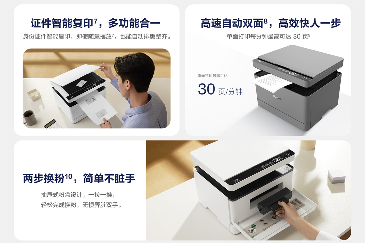 省時(shí)省紙張的自動(dòng)雙面打印功能,華為畢昇激光打印機(jī)X1系列自然也是有的,并且是后置雙面器的設(shè)計(jì),可顯著降低故障率,同時(shí)具備翻頁速度快以及噪音小的優(yōu)點(diǎn)。打印速度方面,華為畢昇激光打印機(jī)X1系列至高可達(dá)30頁/分鐘,即便是辦公用途也能勝任對(duì)高效率的需求。