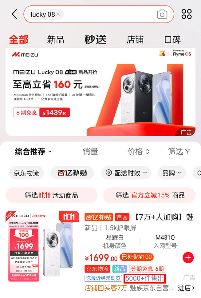 魅族預(yù)熱的“幸運”二字,讓人聯(lián)想起一個月前魅族推出的Lucky 08手機,這款手機上市一個月,京東自營顯示有5000+件售出,淘寶魅族官方旗艦店則顯示有800+人付款,魅族官網(wǎng),用戶評價數(shù)量只有可憐的67條。鑒于目前魅族線下旗艦店稀少,魅族手機的銷量應(yīng)該大部分來自線上,幾大平臺的量加起來銷量一個月還不過萬,很顯然魅族Lucky 08的銷量慘不忍睹。