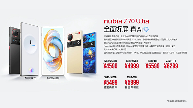 定價方面,努比亞Z70 Ultra起售價為4599元,多個容量版本都是比Z60 Ultra漲了300元,將于11月25日正式發(fā)售。此外,努比亞Z70 Ultra繼續(xù)更新了特色的星空典藏版,以梵高元素探索藝術(shù)的自信表達,且這個版本還提供雙向衛(wèi)星通話功能,不過星空版的價格漲幅達到500元。