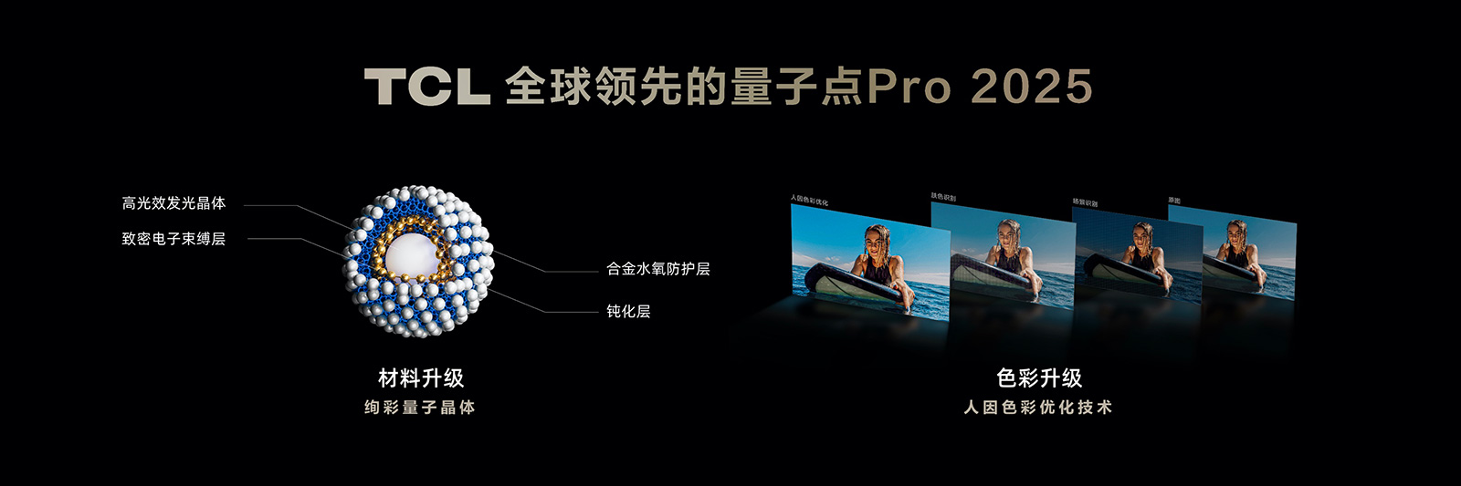 在材料方面,量子點(diǎn)Pro 2025進(jìn)行了全面升級(jí)。由四元量子晶體升級(jí)為絢彩量子晶體,使用復(fù)合納米金剛結(jié)構(gòu),并采用多層共擠技術(shù)和高精密混合技術(shù)制成量子點(diǎn)層,大幅提升發(fā)光效率。同時(shí),TCL采用人因色彩優(yōu)化技術(shù),通過(guò)智能識(shí)別畫(huà)面色彩,根據(jù)畫(huà)面不同顏色采用動(dòng)態(tài)色彩管理,進(jìn)行多維渲染,讓量子點(diǎn)的色彩顯示更符合人眼對(duì)世界的感知。