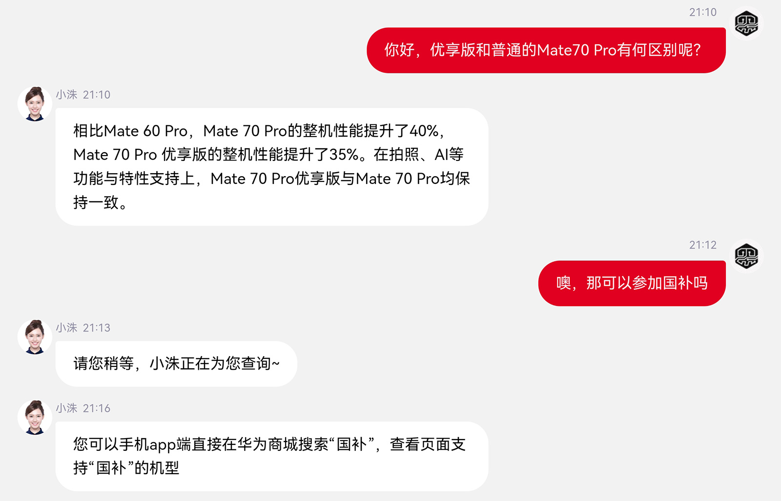 根據(jù)華為客服的描述,華為Mate70 Pro相比Mate60 Pro的整機(jī)性能提升40%,而華為Mate70 Pro優(yōu)享版則提升了35%,拍攝、AI等功能與特性,Mate70 Pro優(yōu)享版與Mate70 Pro保持一致。由數(shù)據(jù)對(duì)比來看,Mate70 Pro優(yōu)享版的性能相當(dāng)于Mate70 Pro的96%,日常使用場(chǎng)景下的體驗(yàn)感知差異很小。