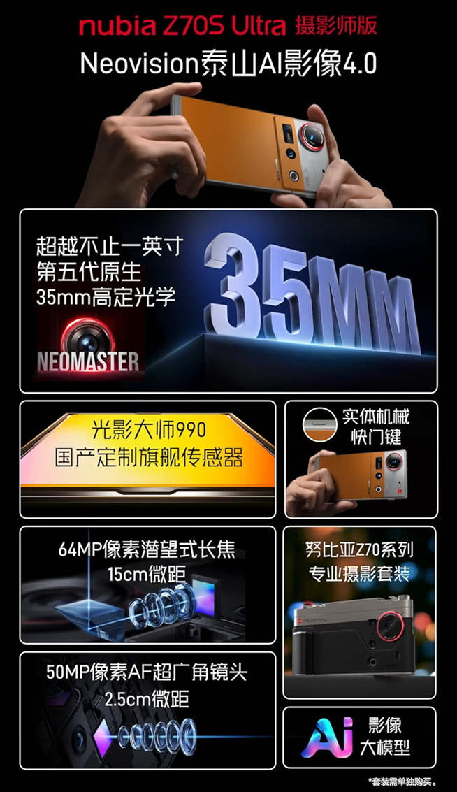 總體而言,努比亞Z70S Ultra攝影師版相比去年11月推出的Z70 Ultra,主要變化是更換了主攝,加大了電池,價(jià)格不變。而新增由Fotorgear定制的攝影套裝售價(jià)899元,主要玩法是復(fù)刻相機(jī)的造型。