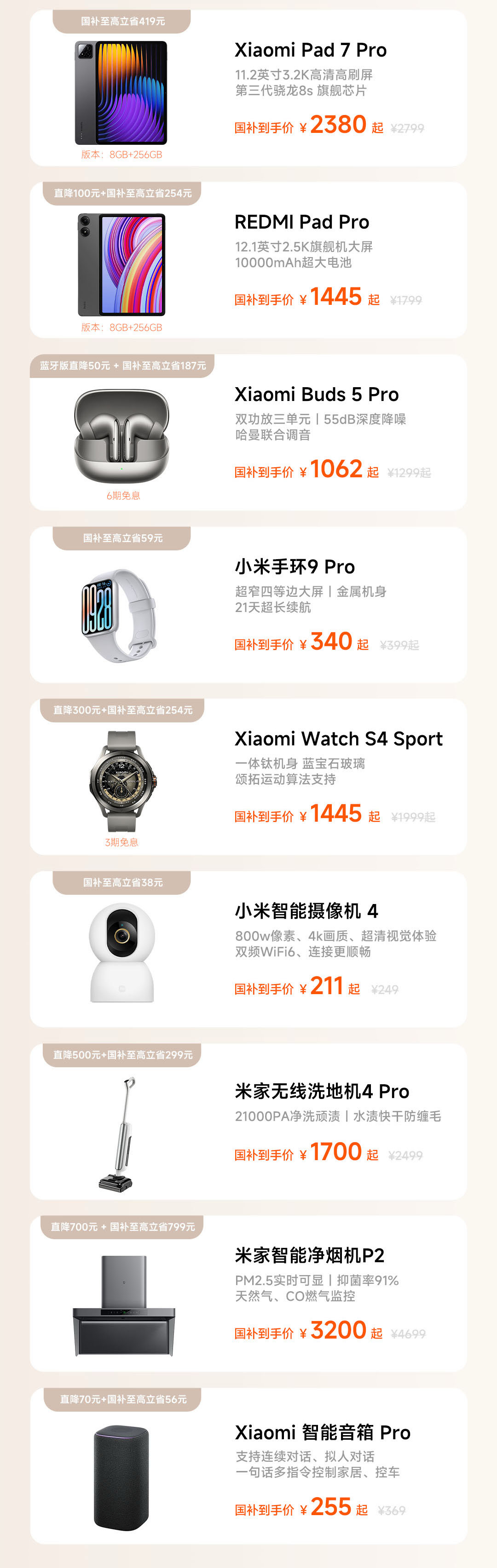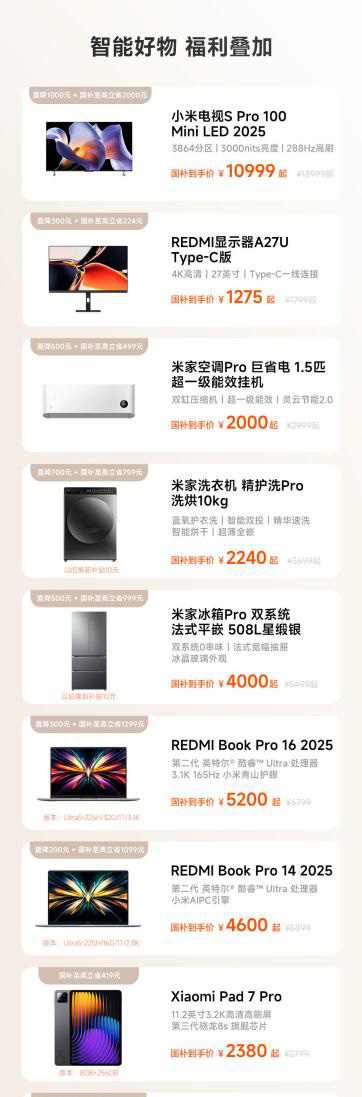 大家電方面至高省3000元!小米電視S Pro 100 Mini LED 2025版,官方直降1000元起,國補(bǔ)至高補(bǔ)貼2000元,到手價(jià)10999元起;米家空調(diào) Pro 巨省電 1.5 匹超一級(jí)能效掛機(jī),國補(bǔ)到手價(jià)只要 2000 元起。超一級(jí)能效,全年省電又省錢,全新升級(jí)雙缸壓縮機(jī),運(yùn)行穩(wěn)又輕音。米家洗衣機(jī)精護(hù)洗 Pro 洗烘 10kg,國補(bǔ)到手價(jià) 2240 元起。米家冰箱 Pro 雙系統(tǒng) 法式平嵌 508L 星緞銀,國補(bǔ)到手價(jià) 4000 元起。