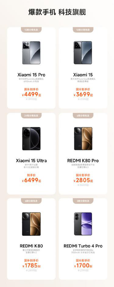 爆款手機(jī)、智能好物,小米眾多先進(jìn)科技單品,超多優(yōu)惠即刻開啟。在手機(jī)方面,諸多爆款機(jī)型支持特惠,小米 15 系列、K80系列等多款產(chǎn)品都有優(yōu)惠。其中,小米15可享500 元國補(bǔ),到手價(jià)僅需3699元起;REDMI K80官方閃降200元,疊加國補(bǔ)以及平臺(tái)各種福利到手僅1785 元起,K80 Pro 官方閃降 400 元,疊加國補(bǔ)以及平臺(tái)各種福利到手價(jià) 2805 元起;REDMI Turbo 4 Pro全版本優(yōu)惠 200 元,國補(bǔ)到手價(jià)1700元起;此外小米全新徠卡影像旗艦小米15Ultra,限時(shí)買贈(zèng)價(jià)值1496元尊享服務(wù)權(quán)益,包括碎屏保、后置攝像頭保、電池蓋保、電池保等多重權(quán)益。
