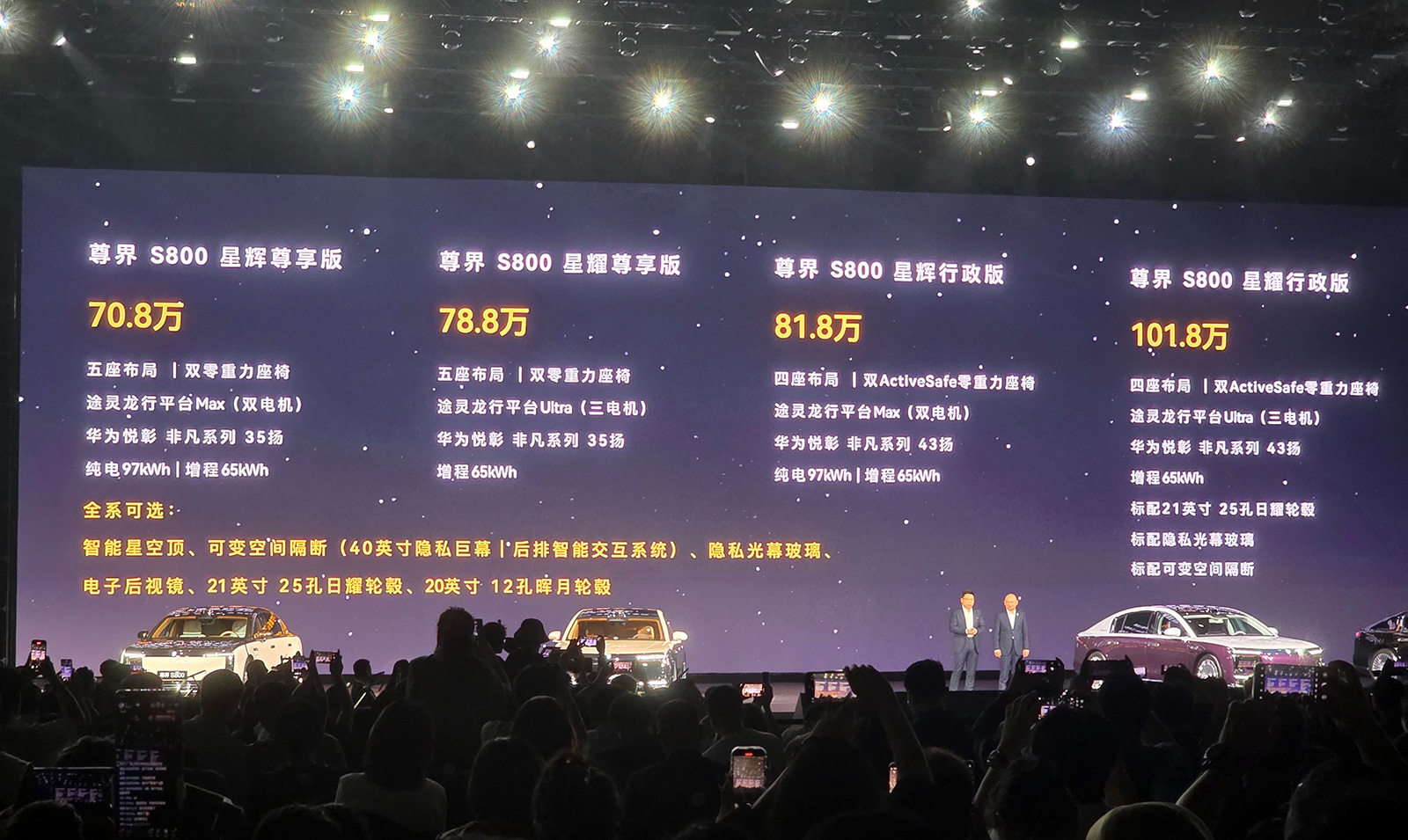 尊界S800提供四款車型配置,價格從70.8萬元至101.8萬元,6月26日開始交付限量599臺的“先行者計劃”,預計8月中旬開始大規(guī)模交付。