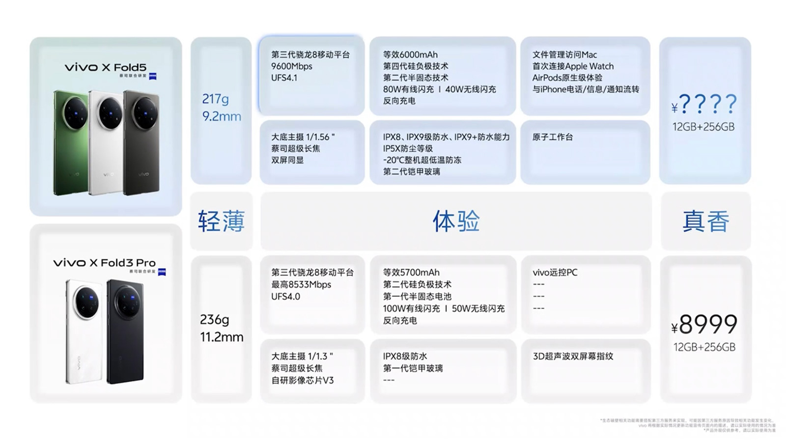 vivo強(qiáng)調(diào),X Fold5是當(dāng)下最輕的大折疊手機(jī),僅重217克。不過上代的X Fold3重量為219克,其實(shí)已經(jīng)很輕了,二者的差距非常小。在查看X Fold5參數(shù)時(shí)我們還發(fā)現(xiàn),原來217克、9.2毫米厚的X Fold5僅限“ 鈦度”版本,另外兩款顏色會(huì)更重也更厚一些,“明白”和“青松”的重量及厚度分別為226克、4.55毫米/9.7mm毫米。正如隔壁友商OPPO Find N5強(qiáng)調(diào)最薄折疊屏?xí)r沒怎么提是哪款顏色,X Fold5也是類似操作,為了增強(qiáng)營(yíng)銷亮點(diǎn)確實(shí)很拼~