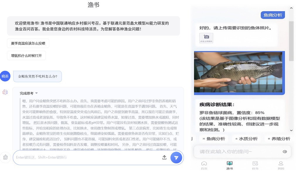“金鯧魚(yú)突然不吃料怎么辦?”“弧菌病怎么防?”。“漁書(shū)”大模型后臺(tái)界面上,漁民的提問(wèn)以彈幕形式滾動(dòng)。過(guò)去,這些問(wèn)題要靠老師傅的經(jīng)驗(yàn)、靠電話(huà)那頭的專(zhuān)家,現(xiàn)在,只需一句語(yǔ)音、一張照片,AI秒回答案。中國(guó)聯(lián)通廣東分公司聯(lián)合華南師范大學(xué)智慧漁業(yè)團(tuán)隊(duì),將52小類(lèi)海量養(yǎng)殖條件、病害、投喂策略等數(shù)據(jù)“喂”給“漁書(shū)”大模型,經(jīng)過(guò)強(qiáng)化學(xué)習(xí)與多模態(tài)微調(diào),讓AI大模型看得懂“魚(yú)臉色”、讀得懂“水情緒”?!皾O書(shū)”大模型對(duì)養(yǎng)殖問(wèn)答的準(zhǔn)確率突破80%,相當(dāng)于把一位資深漁業(yè)專(zhuān)家“裝進(jìn)手機(jī)里”。