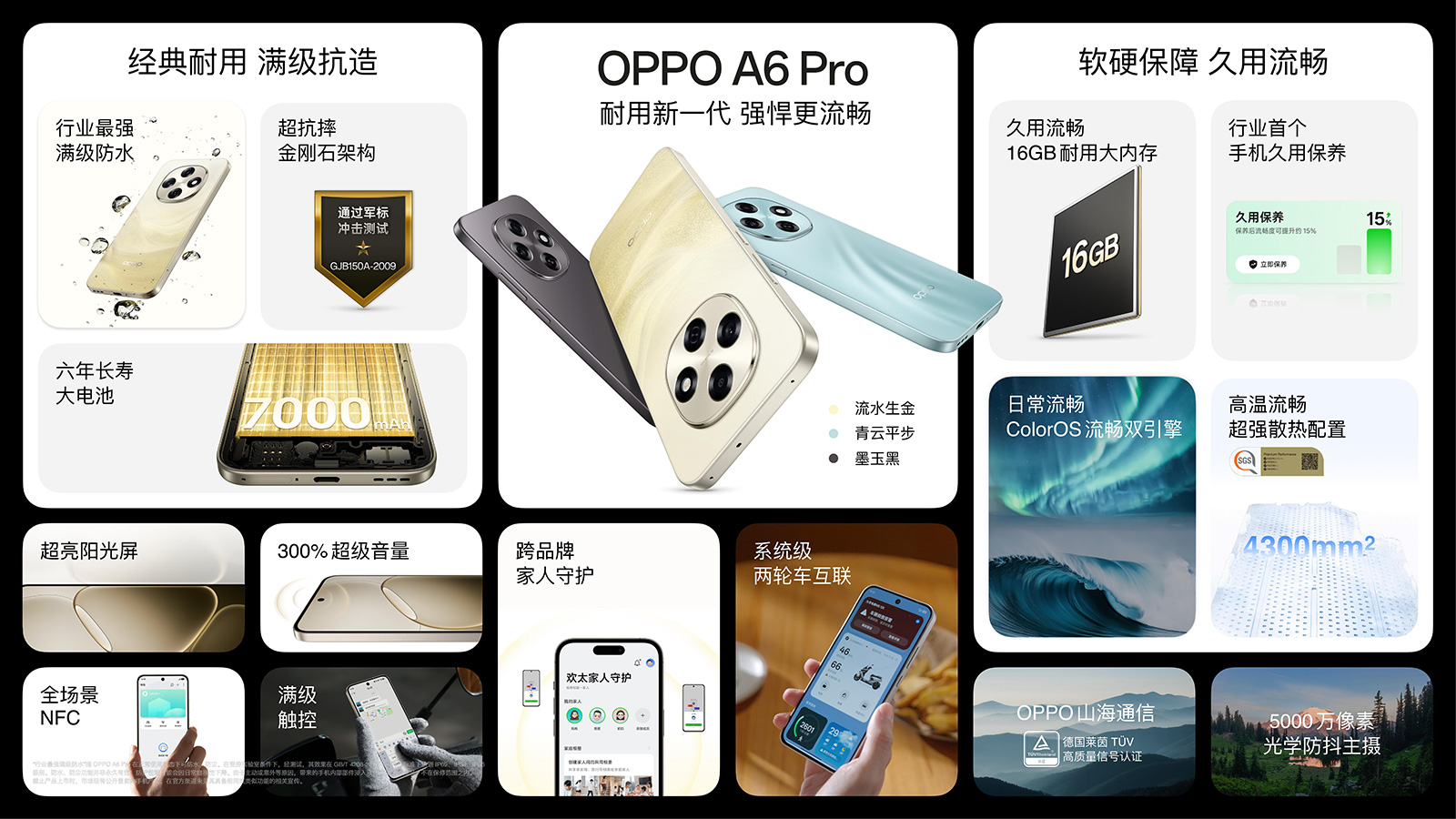 OPPO A6 Pro具備突出的防水、耐摔、耐用特性,防水等級為IP69+IP68+IP66,超抗摔金剛石架構(gòu)和超抗摔玻璃帶來全面抗摔的安心,其硬核品質(zhì)還通過了7項軍標環(huán)境測試。