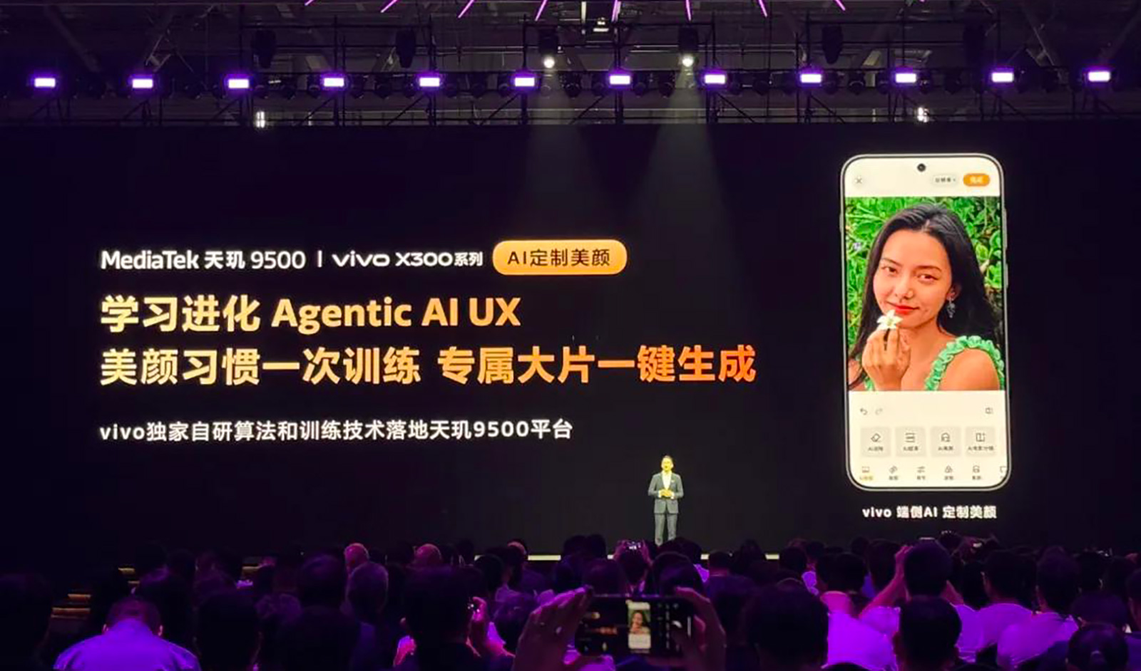 此外,天璣9500創(chuàng)新引入雙NPU設(shè)計(jì),不僅峰值性能翻倍,峰值功耗性能可得到56%的下降,是為超強(qiáng)端側(cè)AI體驗(yàn)而生?;诟鼜?qiáng)大的AI能力,天璣攜手vivo X300系列手機(jī),將帶來(lái)可學(xué)習(xí)和進(jìn)化的AI定制美顏,專(zhuān)屬大片一鍵生成。