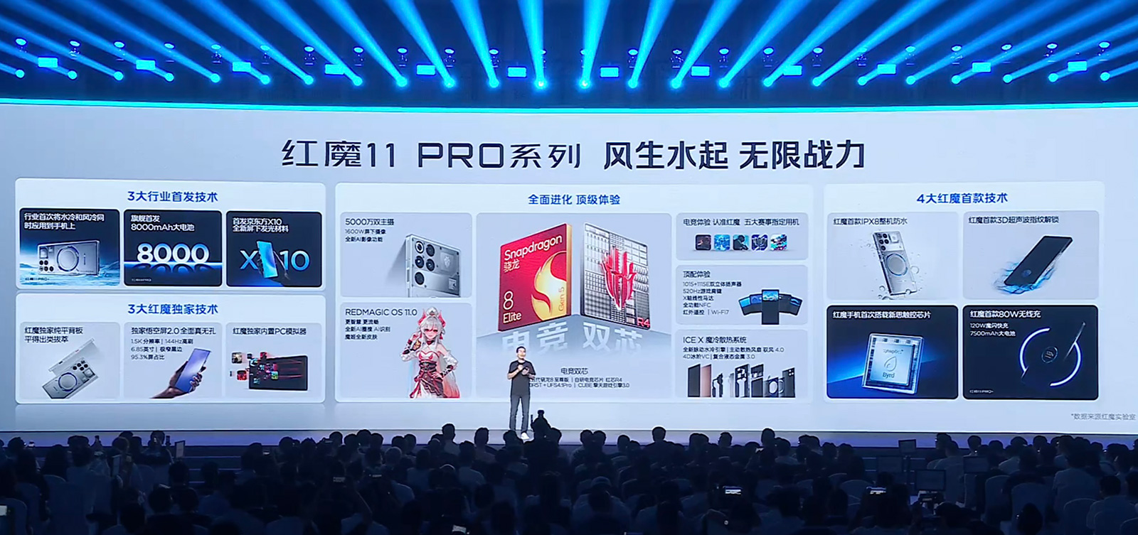 在發(fā)布會(huì)上,紅魔游戲手機(jī)產(chǎn)品總經(jīng)理姜超表示,友商的風(fēng)冷效果相當(dāng)于紅魔的1.0版本,現(xiàn)在紅魔11 Pro已進(jìn)化至3.0版本。在友商的鞭策下,紅魔11 Pro系列的風(fēng)扇轉(zhuǎn)速終于實(shí)現(xiàn)突破,其每分鐘轉(zhuǎn)速提升至24000轉(zhuǎn),風(fēng)冷散熱的表現(xiàn)得到加強(qiáng)。為探索手機(jī)散熱的更多可能性,紅魔11 Pro+專(zhuān)門(mén)打造了水冷解決方案,并通過(guò)透明后蓋直接將藍(lán)透的圓環(huán)、循環(huán)轉(zhuǎn)動(dòng)的水冷液展示在用戶(hù)面前。雙冷方案結(jié)合,紅魔游戲手機(jī)能夠更快散熱。