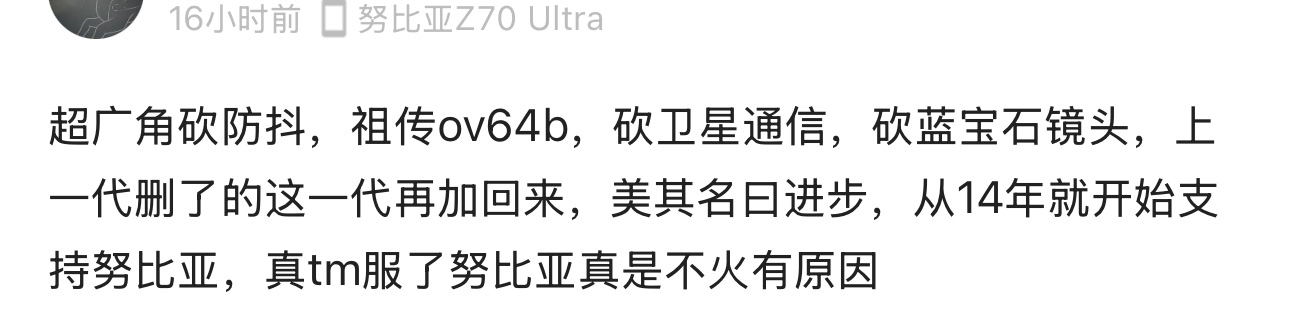 作為對比,近期多家主流手機品牌的旗艦新機都在發(fā)力長焦,包括vivo、OPPO、榮耀、真我,均有新機型配備2億像素長焦。長焦配置的落后加上原本努比亞的影像算法就沒那么強,遠拍成了努比亞旗艦機相對較弱的環(huán)節(jié)。