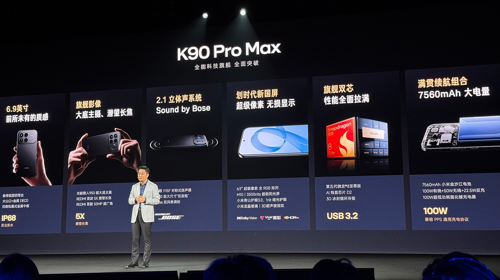 接下來是重磅打造的REDMI K90 Pro Max,發(fā)布會上由盧偉冰全程介紹。作為REDMI沖擊4000元檔的拳頭產(chǎn)品,K90 Pro Max實現(xiàn)了REDMI手機有史以來的屏幕尺寸新高、音頻水準(zhǔn)新高、影像新高、性能新高。其還是業(yè)內(nèi)首款配備2.1立體聲系統(tǒng)的手機,盧偉冰強調(diào)“不是行業(yè)的第一,而是唯一”。