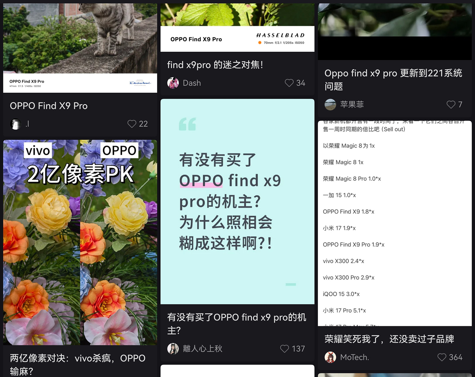 憑借孫穎莎代言、“萬元內(nèi)最值得購買的相機”、口袋哈蘇、全焦段哈蘇8K超清照片、等亮點,OPPO Find X9 Pro一度炙手可熱。然而不少用戶入手后發(fā)現(xiàn),OPPO Find X9 Pro主打的影像體驗與官方宣傳相差甚遠。據(jù)大量用戶反饋,這款手機在對焦準(zhǔn)確性、2億像素畫質(zhì)、夜景照片、影像算法、視頻拍攝效果等多方面均存在不足,在社交平臺吐槽的帖子及評論隨處可見。