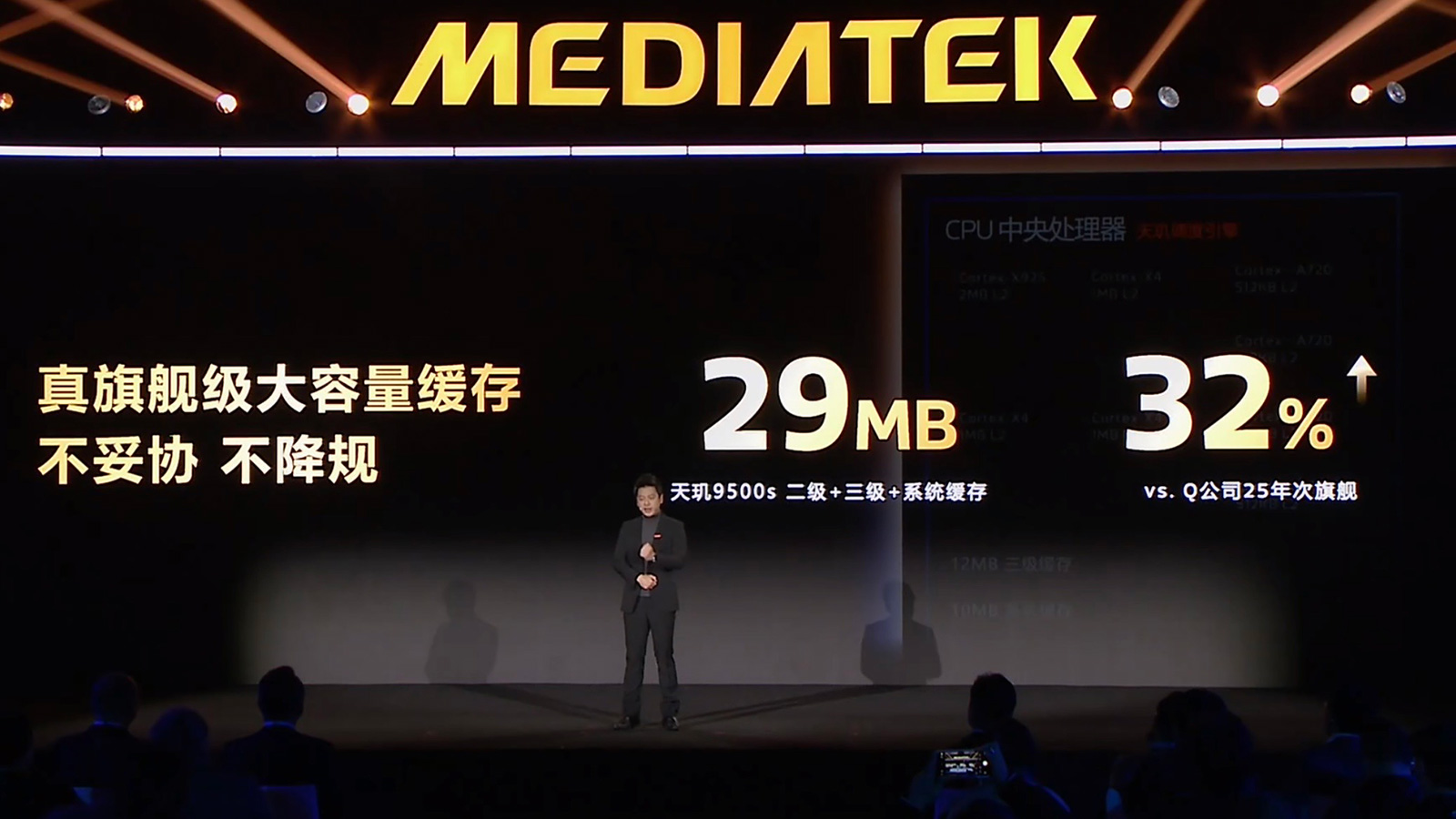 天璣9500s采用先進(jìn)的3納米制程,集成超過290億晶體管,二級(jí)+三級(jí)+系統(tǒng)緩存達(dá)到29MB,相比主要競(jìng)品去年的次旗艦芯片多了32%。