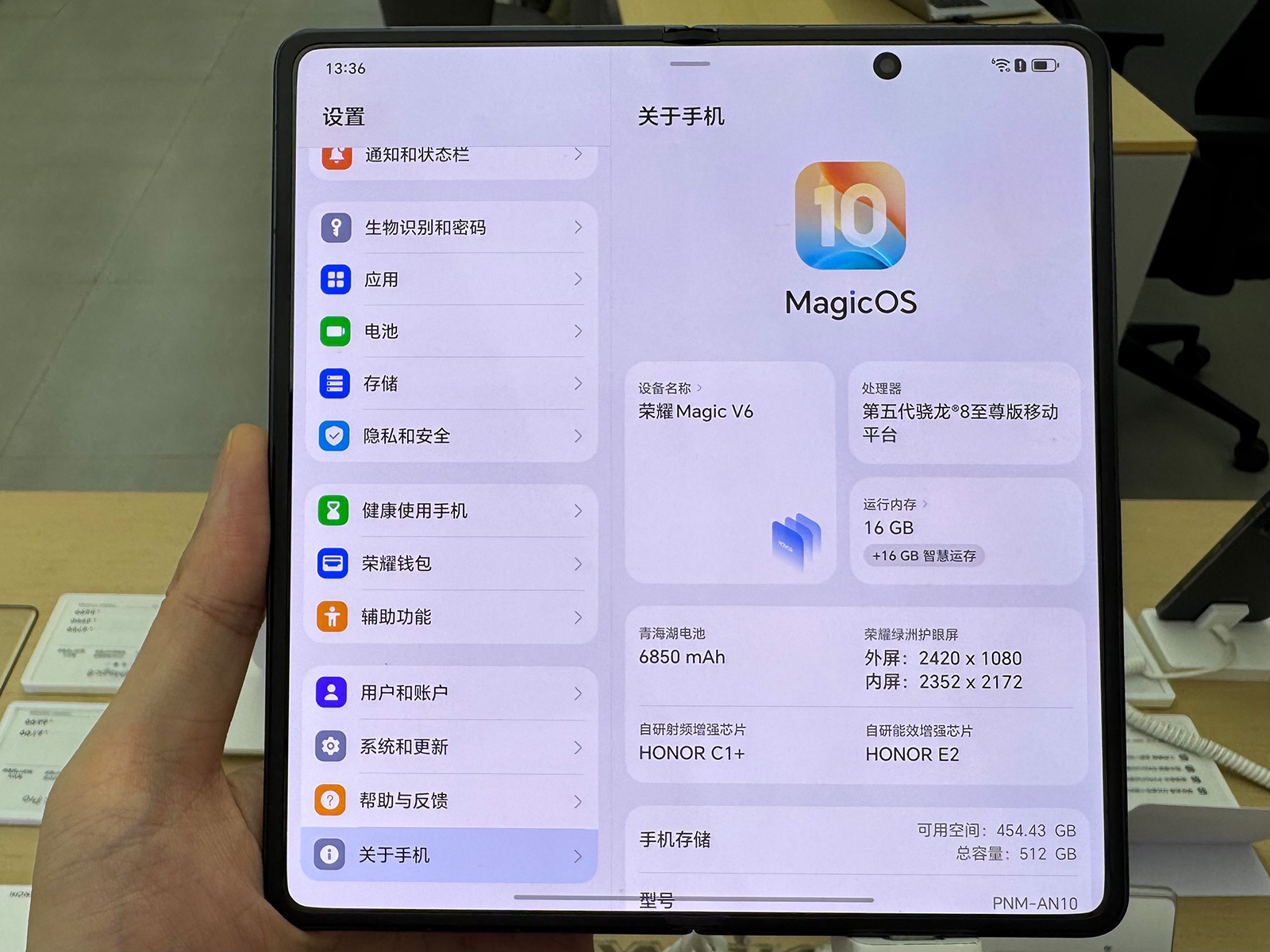 榮耀官方表示,榮耀Magic V6的內(nèi)屏折痕平整度得到了44%的改善,真機(jī)上手來看的確折痕挺淺,但可能是出于更好保護(hù)屏幕的考慮,該機(jī)內(nèi)屏的黑色邊框顯得比較寬,整機(jī)質(zhì)感不算很優(yōu)秀。