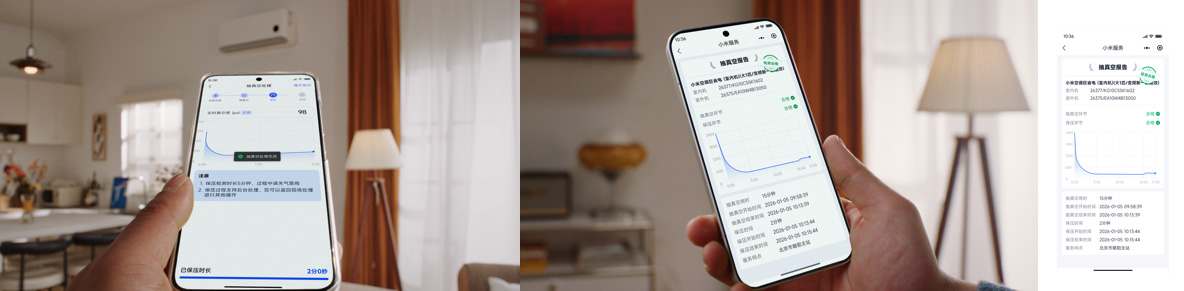 第二,全鏈路數(shù)字化管控,更透明: 真空計通過藍(lán)牙與小米內(nèi)部服務(wù)系統(tǒng)(小米服務(wù)通APP)互聯(lián),壓力數(shù)值、抽吸時長等原始數(shù)據(jù)實時上傳云端。