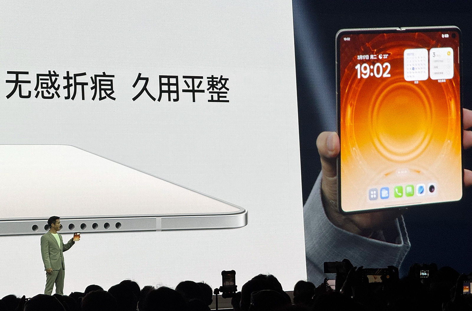 根據(jù)真機(jī)上手體驗(yàn)和觀察,OPPO Find N6內(nèi)屏展開(kāi)后在多種角度下看折痕近乎消失,即便在屏幕全黑狀態(tài)時(shí)的平整度也相當(dāng)高,手指觸摸屏幕中部時(shí),凹陷感極為輕微。可以說(shuō)Find N6折痕表現(xiàn)和平整度,“不怕黑、不挑角度”是當(dāng)前已上市折疊屏機(jī)型的T0級(jí)水準(zhǔn)。該機(jī)還通過(guò)了萊茵60萬(wàn)次折疊久用平整測(cè)試,劉作虎指出,OPPO Find N6的發(fā)布是“折疊手機(jī)史上重要的一天”。