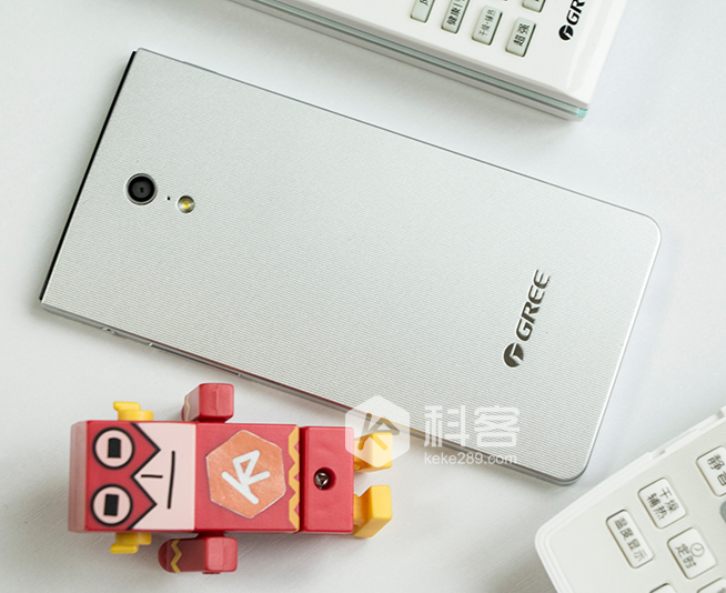 格力手機采用銀色大塑料機身,正面是一塊5.0英寸720屏,三個虛擬鍵排列在屏幕下方。背面紋理較為獨特,攝像頭和閃光燈居于上方正中,而下方印有格力英文logo。