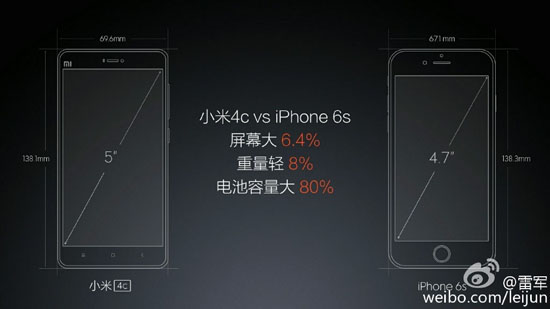 雷軍不服蘋果:小米4c比iPhone 6S輕11克!
